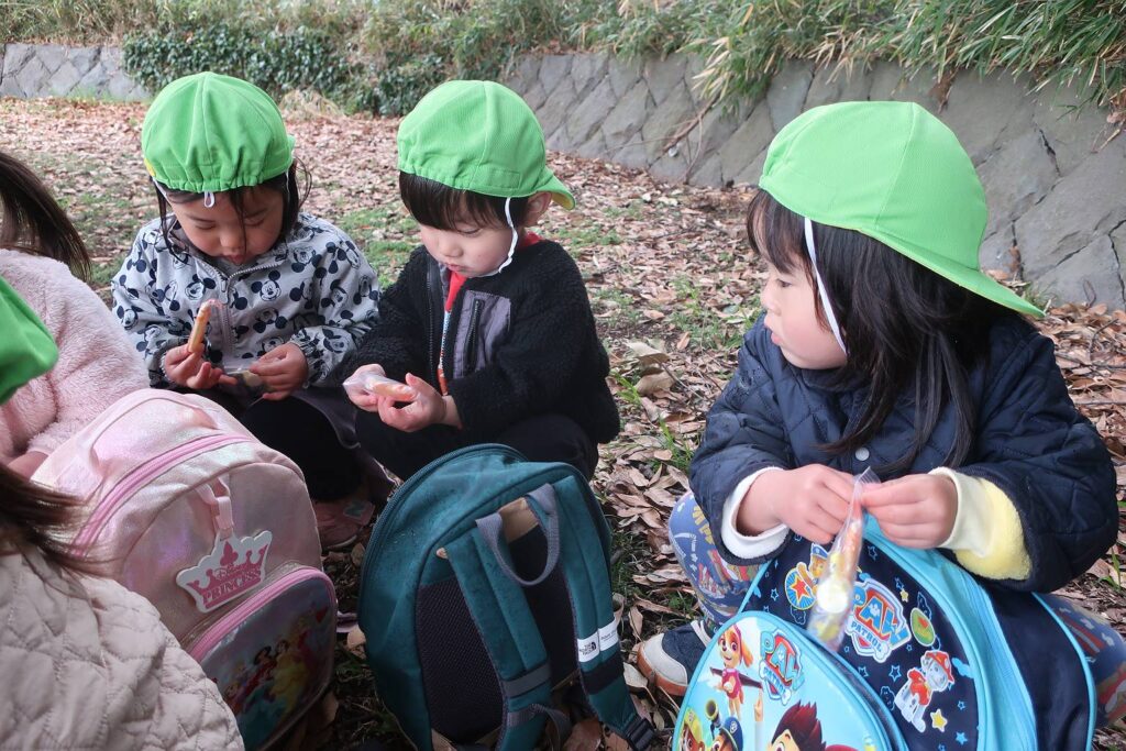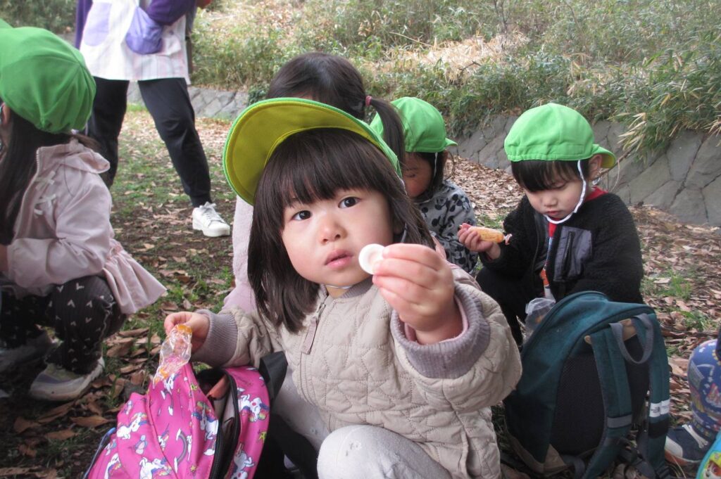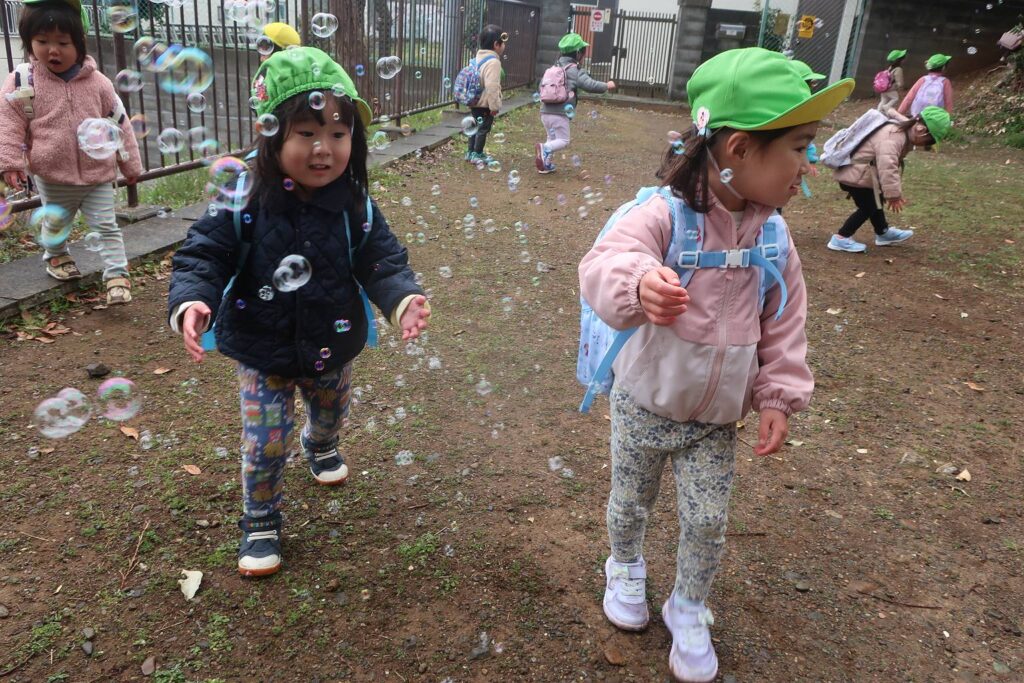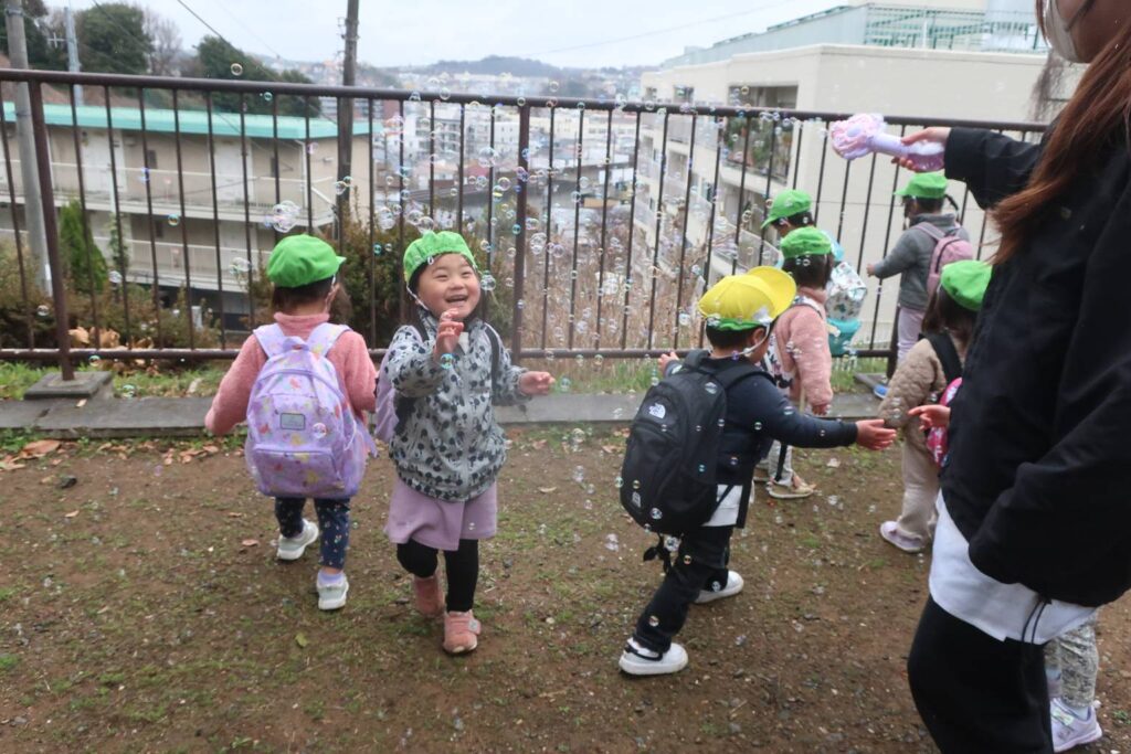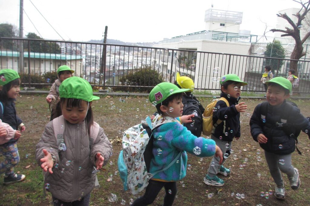 その後は、どんぐり山の大きい木の下でおやつを食べたりしゃぼん玉をしました。