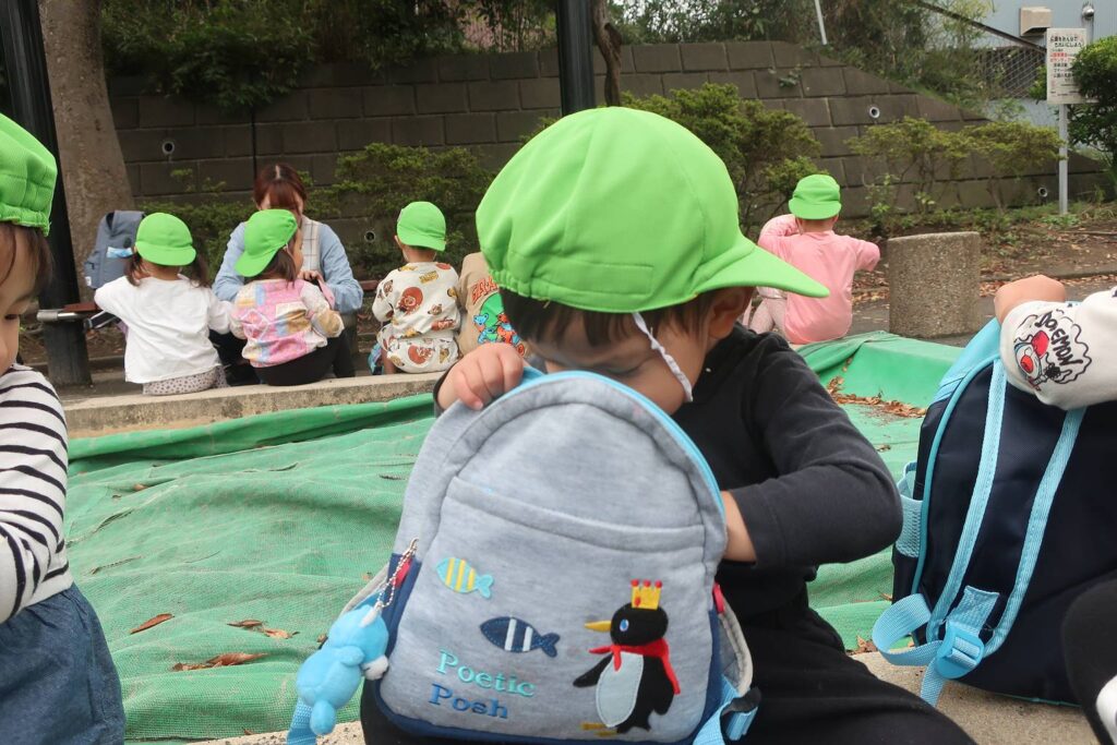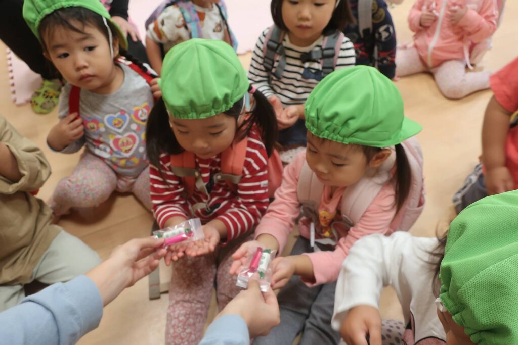出発前におやつのラムネを渡し、リュックにしまいます。おやつは公園でのお楽しみ!