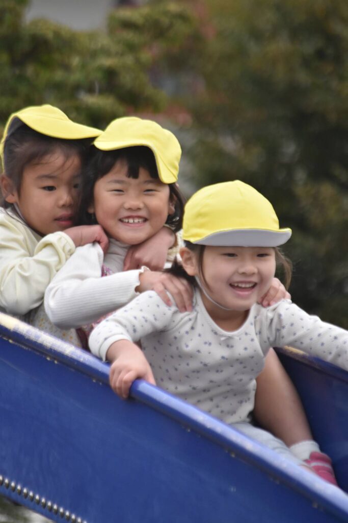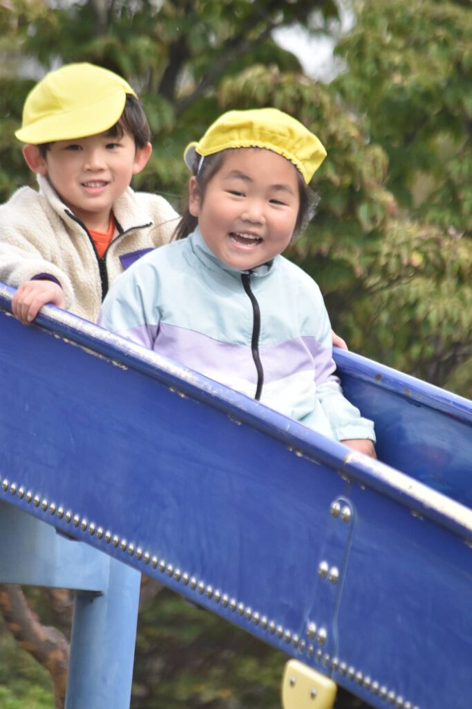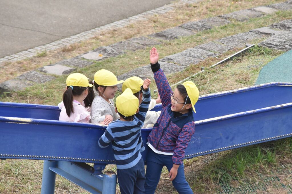 滑ってくるお友だちにハイタッチをしたり