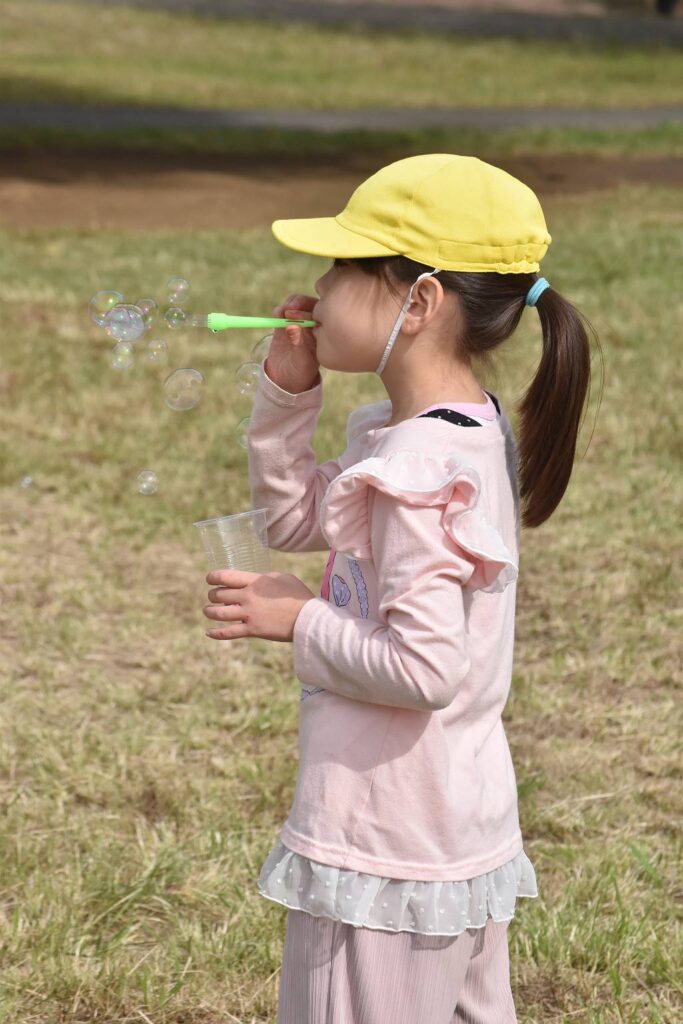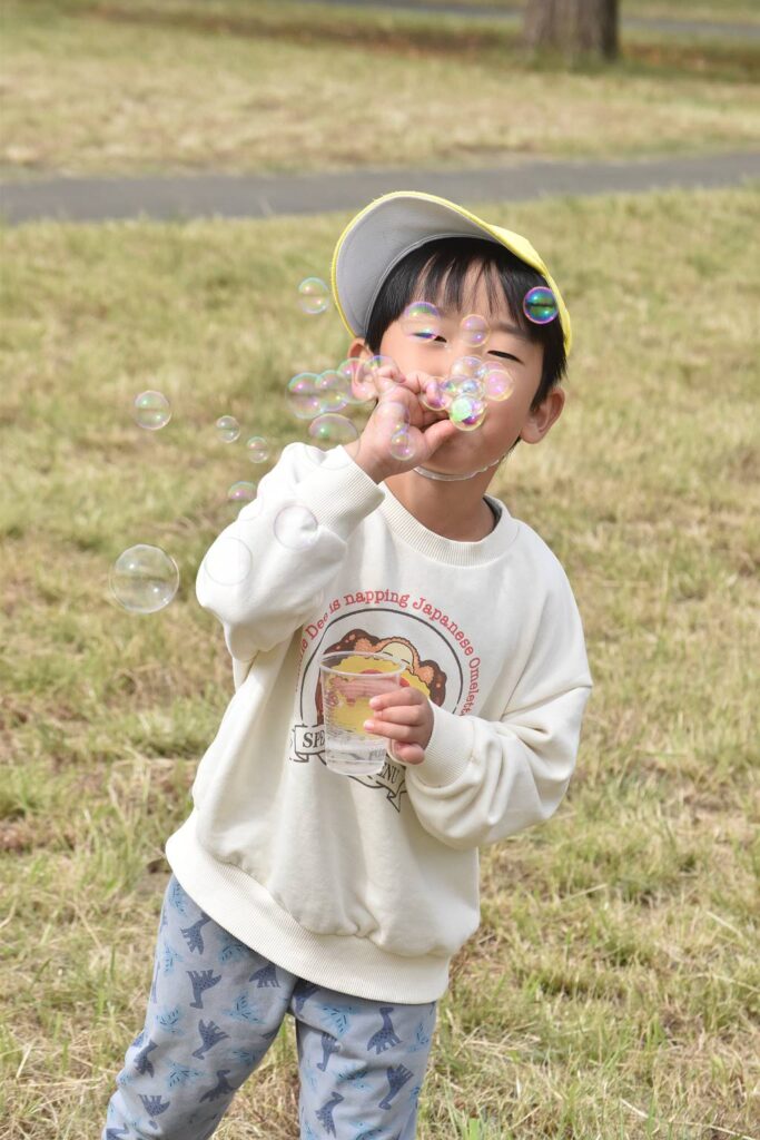 大きく膨らませるように息の拭き方を考えてみたり、お友だちが作ったシャボン玉を