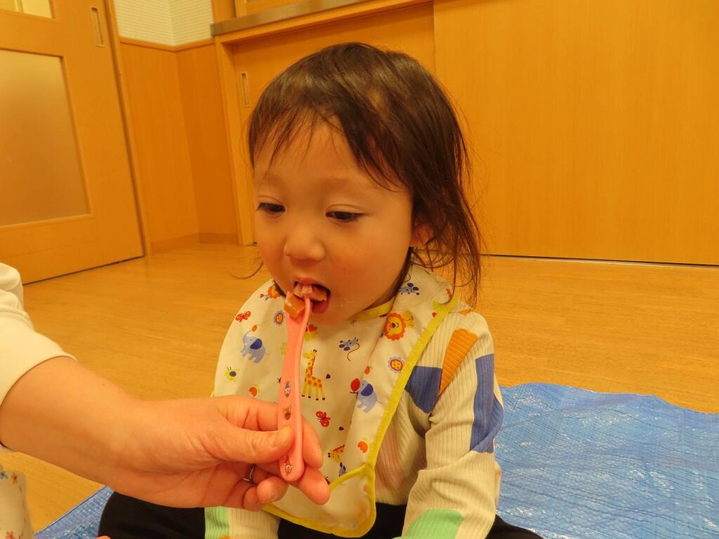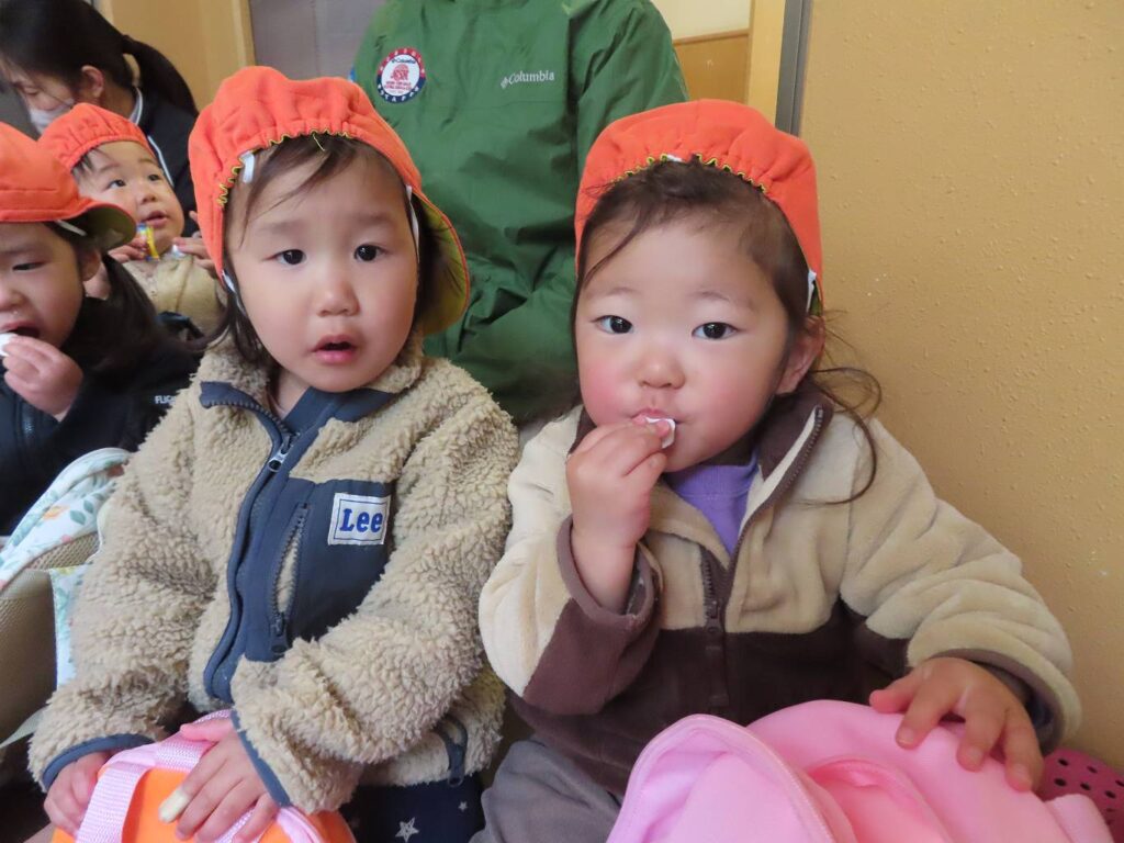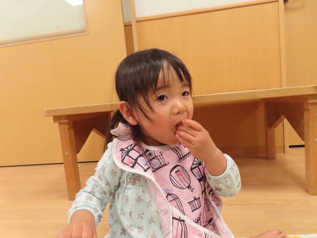 まず初めはおやつの時間!せっかくなので中庭に出て、お外でおやつにしましたよ。