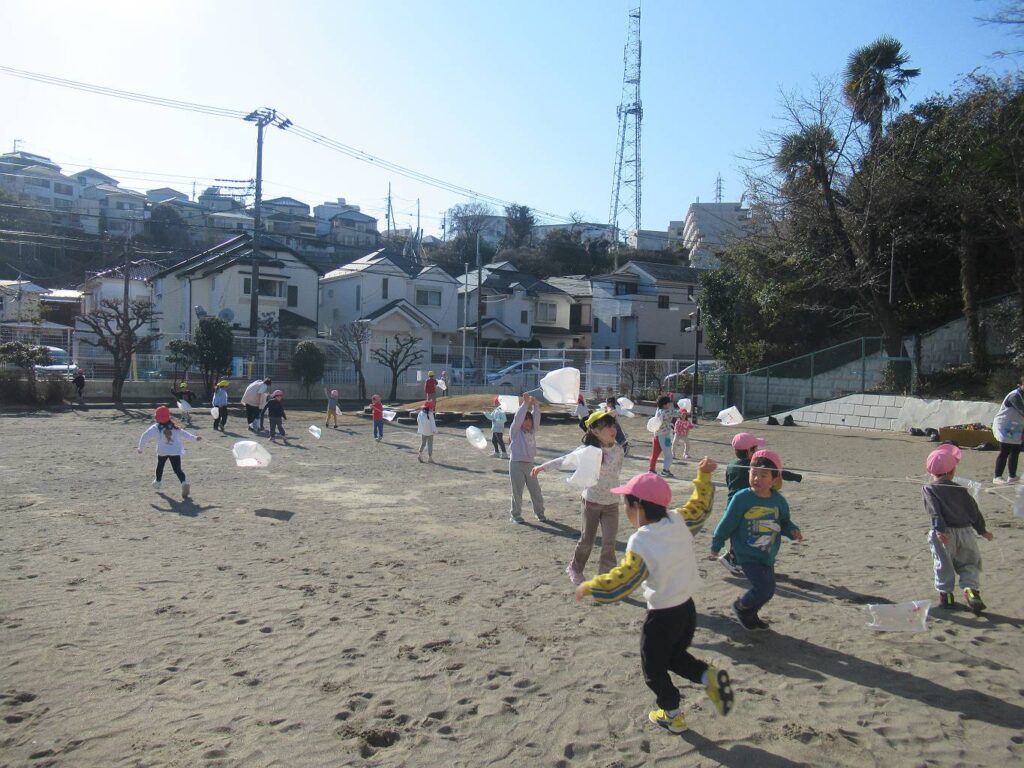 園庭では凧揚げ、羽根つきをしました。