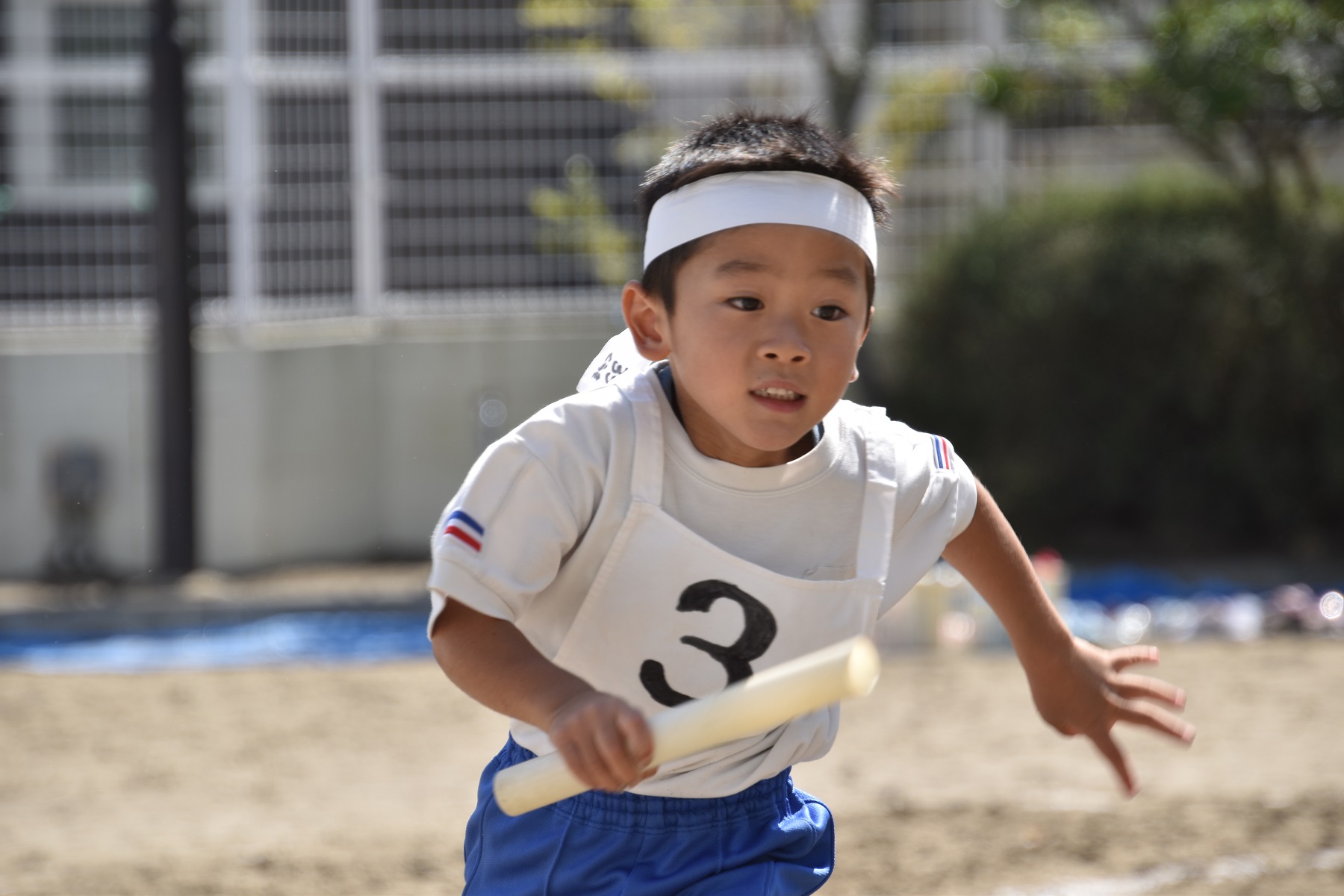 運動会の一番おしまいのプログラムは年長の紅白リレーです。